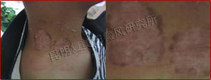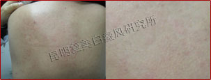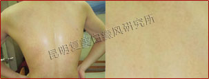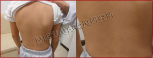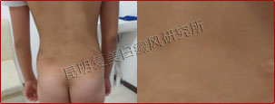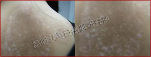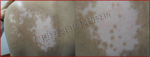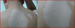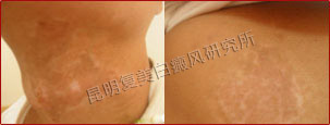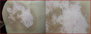 初诊时,患者背部片状白斑明显,色素完全性脱失,边缘模糊,属于局限型白癜风、进展期。