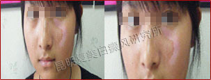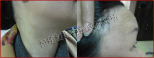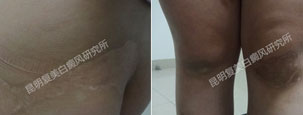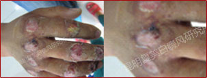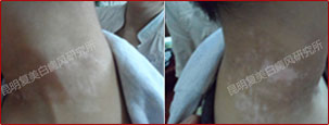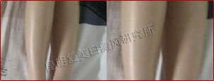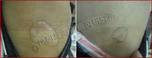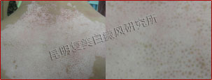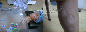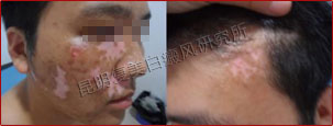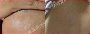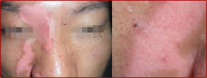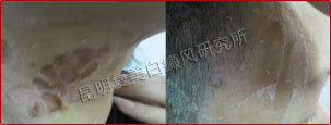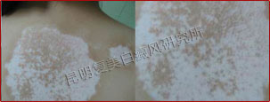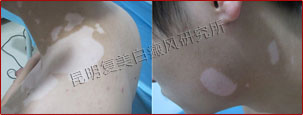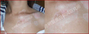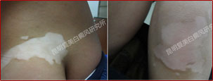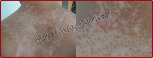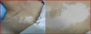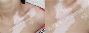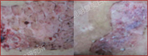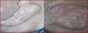 先采用308nm准分子光治疗系统对白斑部位进行靶向治疗,身上白斑开始变淡,缩小;针对部分脱失比较严重的白斑,采用黑色素细胞培植术密集培植,使黑色素细胞快速生成覆盖。