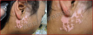3周后患者耳部白斑颜色变淡,面积明显比初诊时缩小,其他部位白斑也开始内缩,跟踪数据显示新生的黑色素正常往白斑区域扩散。