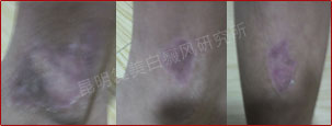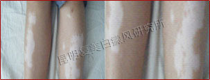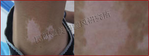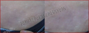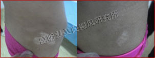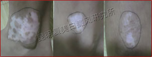 患者接受体外药离子渗透治疗一个疗程,有效改善微循环,增强免疫功能,激活酪氨酸酶活性,白斑从发展期转为稳定期,同时配合308准分子光治疗,白斑开始变淡、内缩,白斑终于开始长出毛囊性黑点。