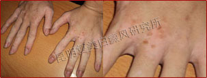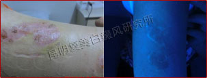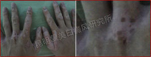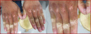 患者来诊时手部的关节处布满白斑,处在活动关节处,平时摩擦很多。伍德灯下白斑呈乳白色,白斑边缘不是平滑的边界线,而且模糊不清,还是处于发展期。