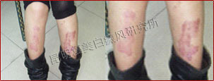 初诊时,患者腿部面积较大,黑色素细胞脱失严重,白斑区域呈瓷白色,边界清晰处于稳定期白癜风。