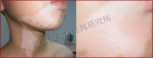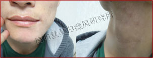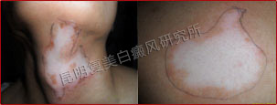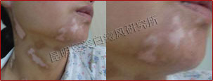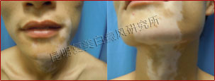 初诊时,下巴及颈部白斑连成大片状,色素脱失85%,白斑边缘模糊不清,仍在发展扩散。