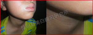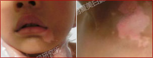 相对于大人来说,儿童的抵御能力较弱。该儿童的白斑面积相对较大,加上部位分布较广,所以治疗起来难度较高。我们在针对患者的治疗过程中,时刻观察患处白斑对于治疗方案的接受程度,三个月的治疗发现,这种动态监控,动态治疗的方案是完全可行的。