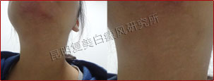 初诊时,患者颈部白斑明显,色素完全性脱失,边缘模糊,处于进展期)。