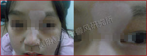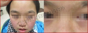 由于患者的白斑长在眼部周围,且色素脱失严重,所以治疗难度比较大。考虑到眼部皮肤比较脆弱及安全性,我们为其采用蓝氧活性净血祛白疗法和308nm准分子光治疗系统内外兼治,这两项技术使用范围广,且绿色安全,有效抗复发。