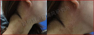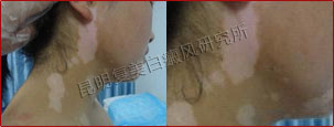 初诊时,患者右颈部白斑明显,边缘模糊,属于局限型白癜风,处于进展期。