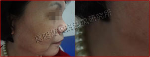 4周以后面部白斑区域生成新的黑色素,但是由于患者没有按照医嘱避免擦拭化妆品,导致左脸颊处的白斑有复发迹象。