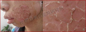 初诊时,患者脸部白斑明显,因长期涂用外用药以及在太阳下暴晒而发红。