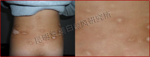 初诊时,患者背部、腰腹部等全身多处散在白斑白点,大小不一。