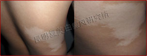 初诊时,患者肉眼可观察出的腿部散在明显白斑,腰部也有些许白斑白点,伍德灯检测下患者白斑面积内有许多小型的色素岛,边缘模糊,处于发展期。