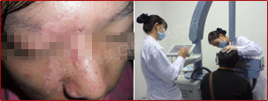 在进行培植手术一周后拆敷料,明显发现白斑处皮肤泛红,专家表示这是治疗有效的表现,为了巩固疗效,配合使用308nm准分子光治疗系统进行治疗。