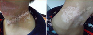 蓝氧配合308光疗治疗一个月后,颈部白斑缩小,边界变清晰,病情转为稳定期。再为其难治部位白斑进行黑色素细胞培植术。