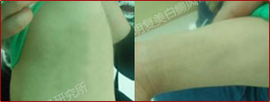 初诊时,患者手臂面积较大,白斑边缘模糊,处于发展期,wood灯照射下发现其身上散在多处隐性白斑。