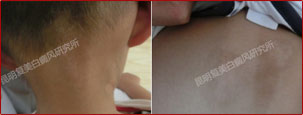 初诊时,患者鬓角和脖子处都有很明显的白斑,是节段型白癜风,白斑边界模糊处于发展期。