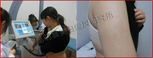 在经过308nm准分子光治疗系统和黑色素细胞培植术三个疗程后,患者的白斑面积明显减少,设备检测显示,随着黑色素的不断新生,皮肤颜色逐渐向周围正常区域的肤色演变。