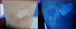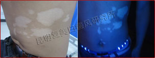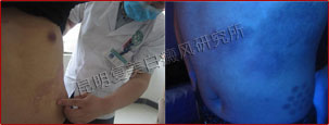 初诊时,患者腹部分散片状白斑,wood灯照射下,白斑脱色严重,部分白斑周围模糊,还处于发展期。