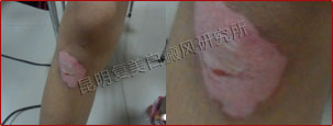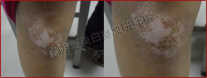 先采用308nm准分子光治疗系统对白斑部位进行靶向治疗,身上白斑开始变淡,缩小;针对部分脱失比较严重的白斑,采用黑色素细胞培植术密集培植,使黑色素细胞快速生成覆盖。