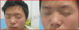由于患者的白斑长在眼部周围,且色素脱失严重,所以治疗难度比较大。考虑到眼部皮肤比较脆弱及安全性,我们为其采用蓝氧活性净血祛白疗法和308nm准分子光治疗系统内外兼治,这两项技术使用范围广,且绿色安全,有效抗复发。